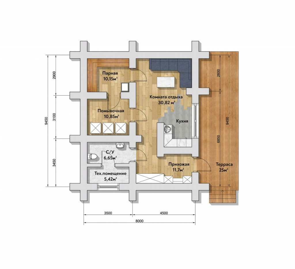 Баня из кедра по данному проекту — это воплощение уюта и традиций, где каждая деталь пространства работает на атмосферу спокойствия, отдыха и максимального комфорта. Логичная, продуманная планировка объединяет просторную зону для дружеских бесед и неспешного чаепития, настоящую парную с ароматными стенами из кедра и классическую помывочную, плавно переходящую из зоны пара. В прихожей удобно разместится верхняя одежда всех гостей, а отдельное хозяйственное помещение и дровник делают баню автономной и подходящей для круглогодичного использования. Отдельное внимание уделено техническому помещению, что гарантирует аккуратное хранение оборудования и легкость ухода за баней.