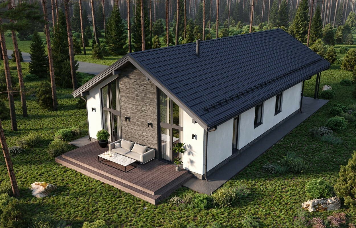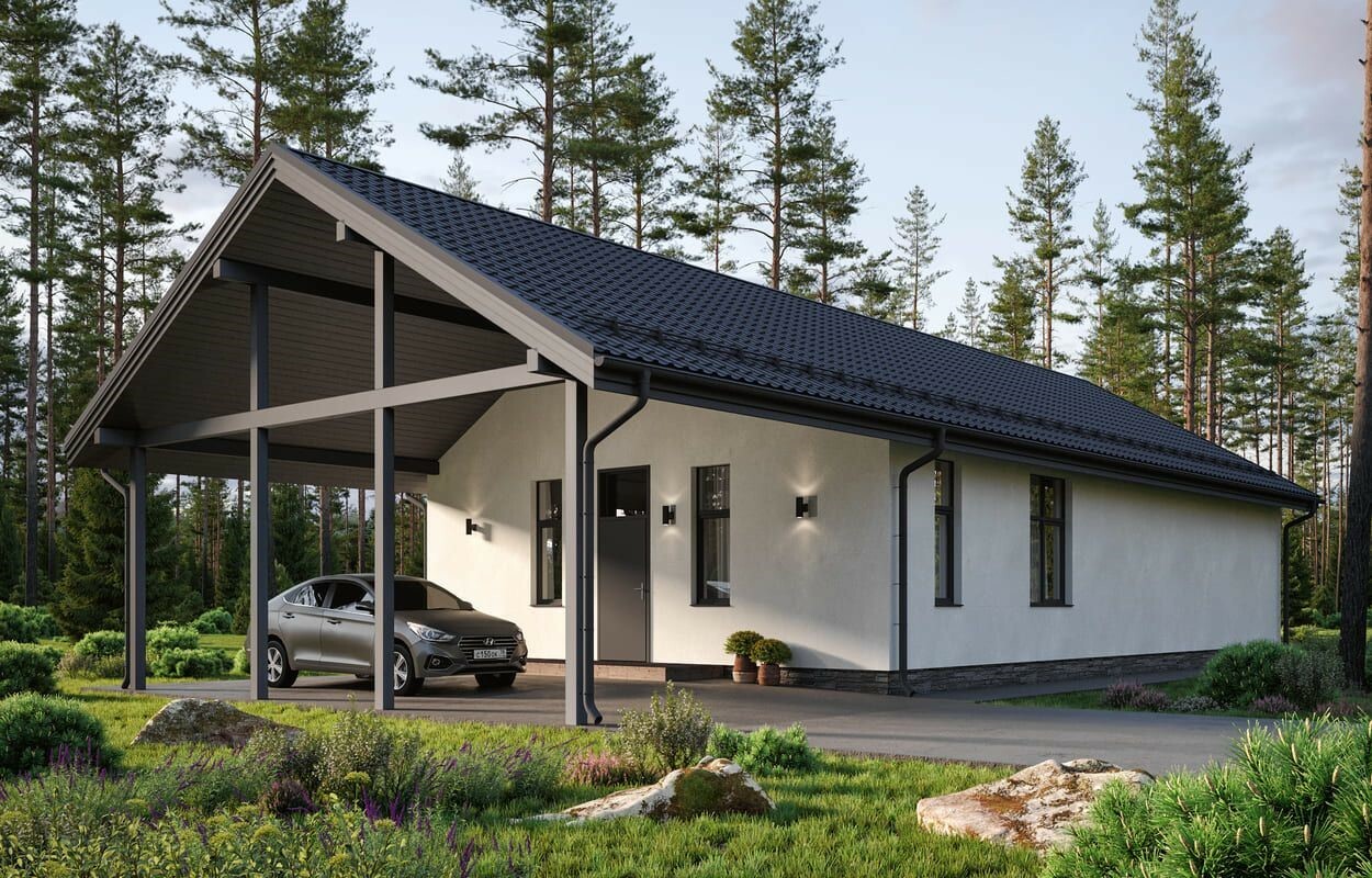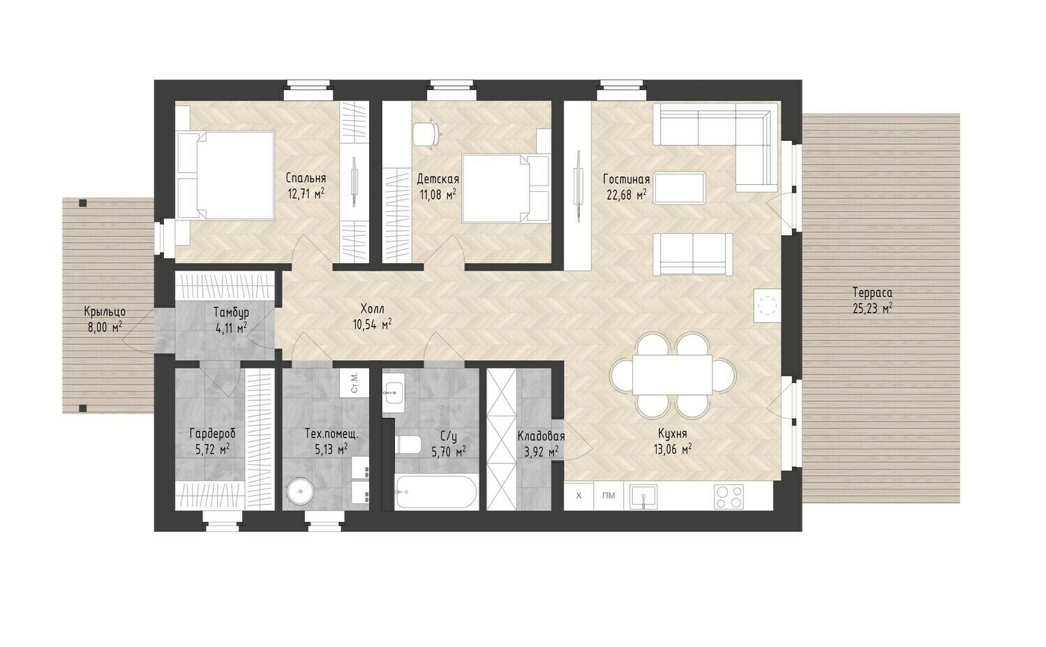 Этот проект дома идеально подходит для семьи из 3-4 человек. В нём есть все необходимые помещения для комфортной жизни: отдельные спальни, просторная гостиная, кухня с выходом на террасу, а также технические и хозяйственные помещения. Дом выполнен в современном стиле с акцентом на функциональность и уют.