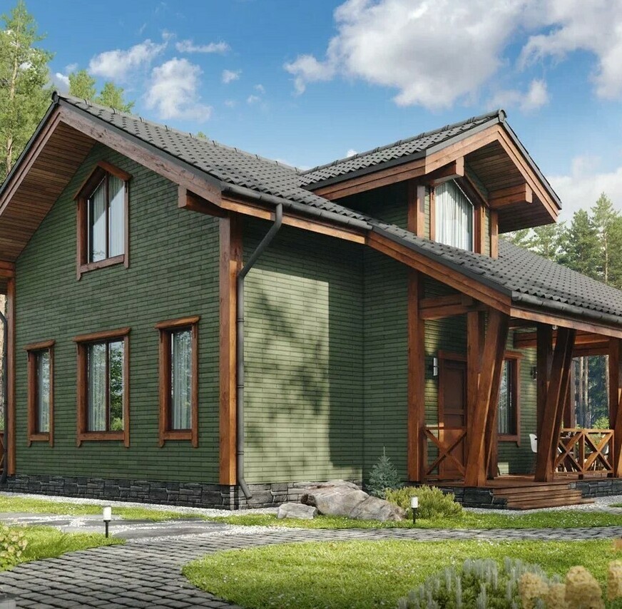 Этот двухэтажный дом площадью 153 м² выполнен из деревянных кирпичей, что обеспечивает экологичность, тепло- и шумоизоляцию, а также привлекательный внешний вид. Планировка дома продумана для комфортного проживания семьи из 4–6 человек.