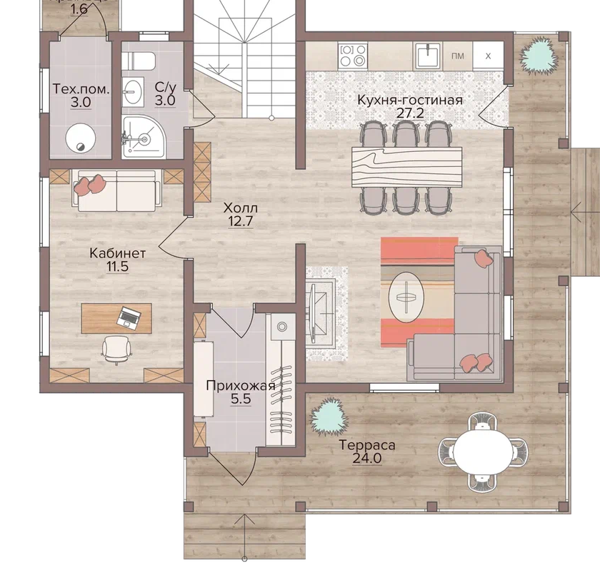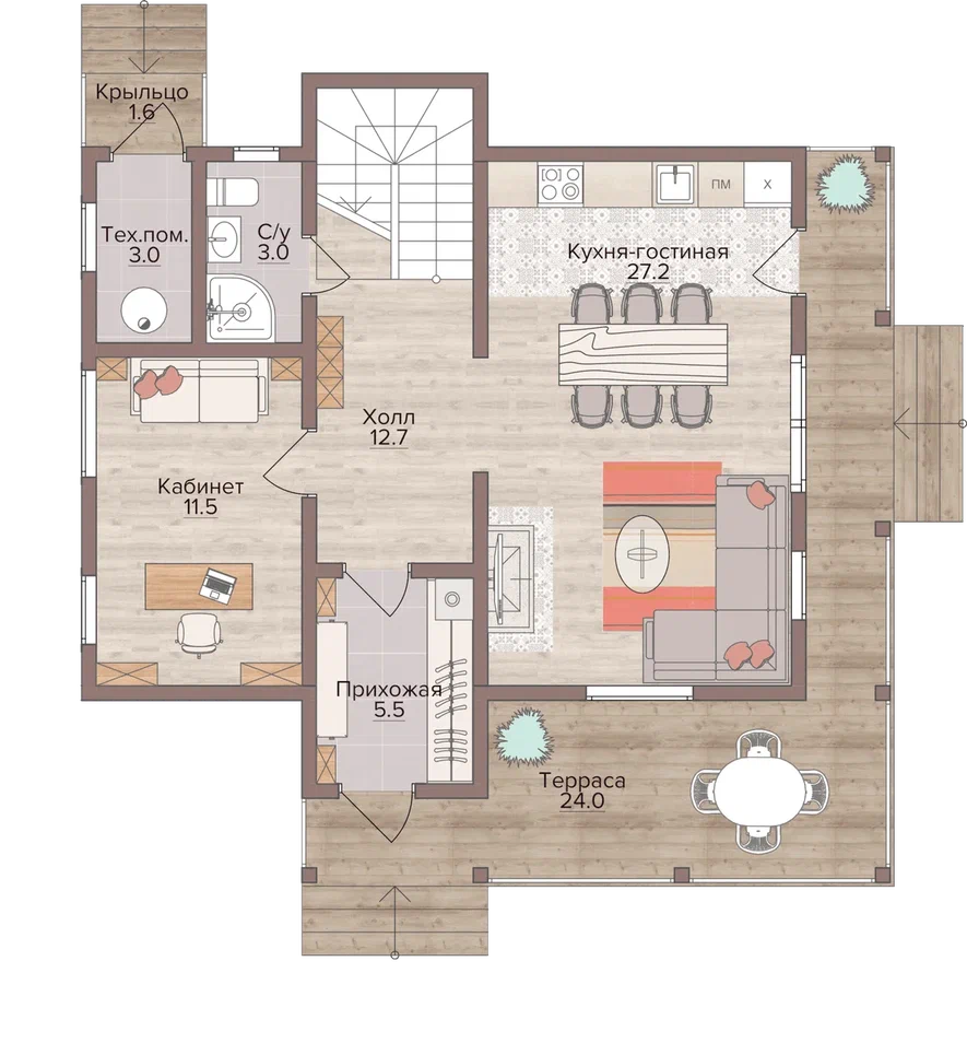 - Холл (12,7 м²) и прихожая (5,5 м²)