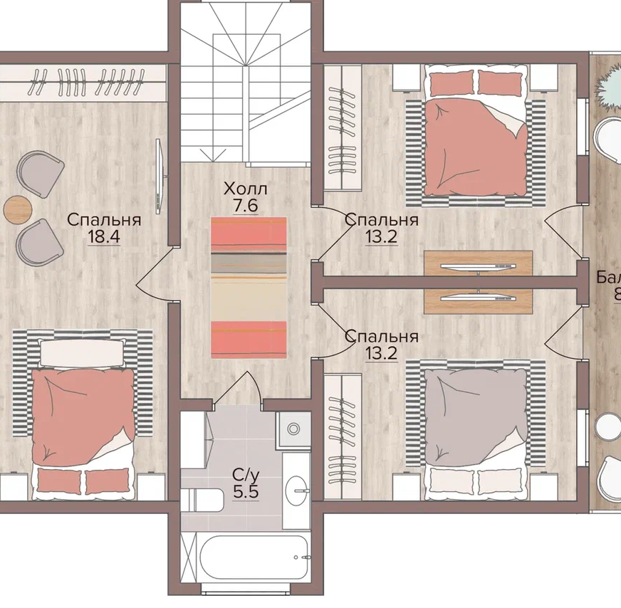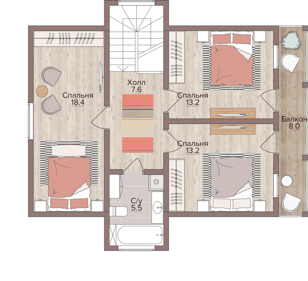 - Три спальни (13,2 м², 13,2 м², 18,4 м²)