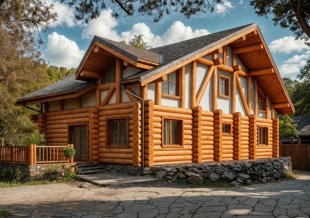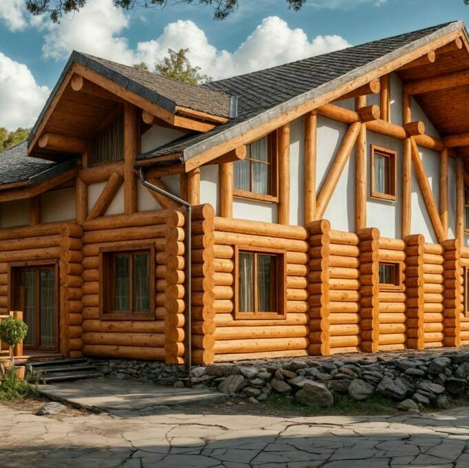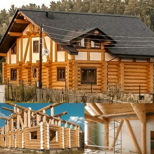 Фундаментные работы. На очищенном участке производится геодезическая разбивка, закладывается ленточный, свайный или плитный фундамент (ширина ленты 40–50 см, глубина 80–120 см). Для тяжёлой крыши применяют особо прочные варианты.