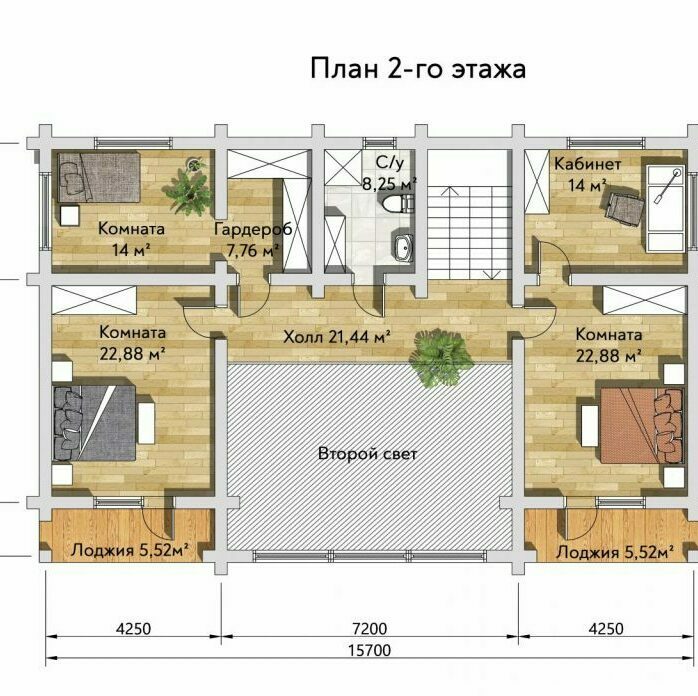 - Холл 21,44 м² — пересадочная зона, выходящая на «второй свет», поддерживает визуальную связь с гостиной первого этажа.