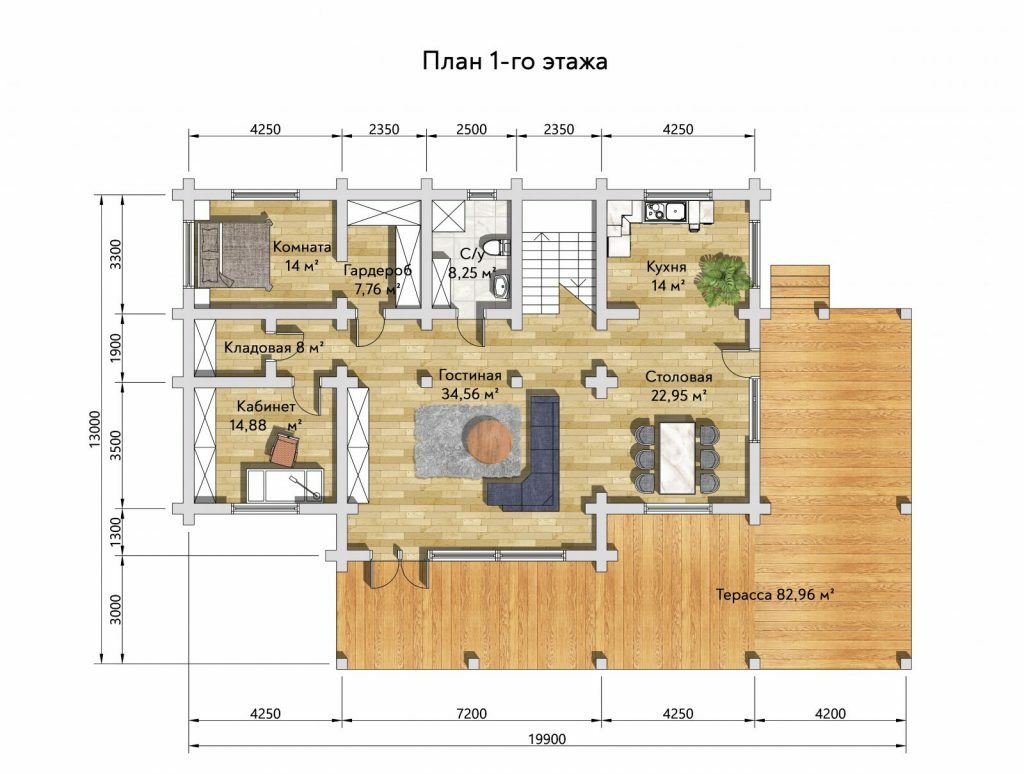 - Терраса 82,96 м² — большая открытая деревянная терраса, служит продолжением столовой/гостиной, идеальна для приёмов и отдыха на свежем воздухе.