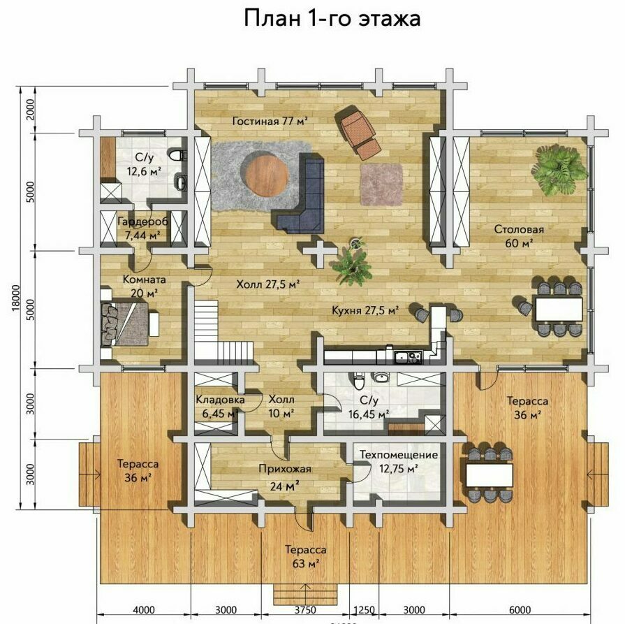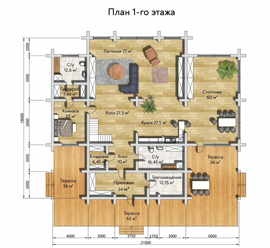 - Терраса перед домом: 63 м²; боковые террасы: по 36 м² каждая.