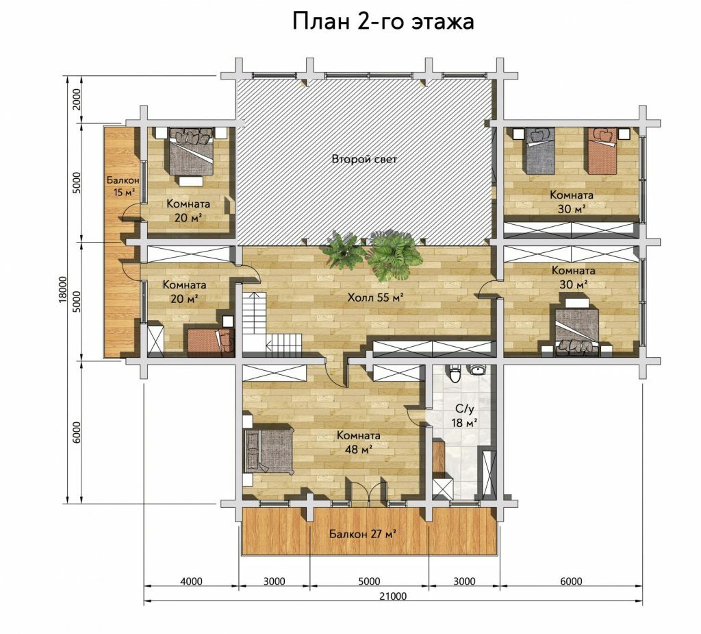 В центральной части второго этажа находится большая комната площадью 48 м², которую легко организовать как мастер-спальню с зоной отдыха или кабинет. Из неё есть удобный доступ к просторному санузлу площадью 18 м², где можно разместить и ванну, и душ, и зону хранения.