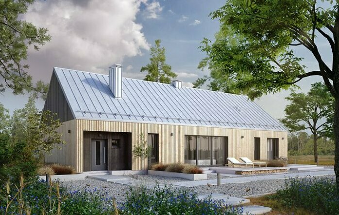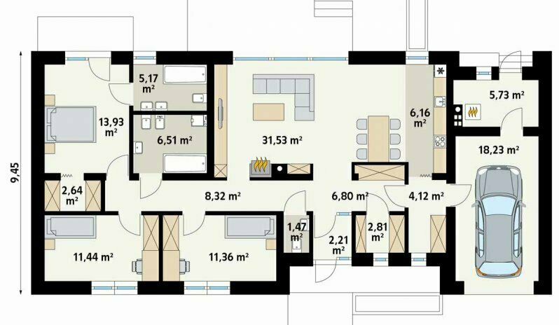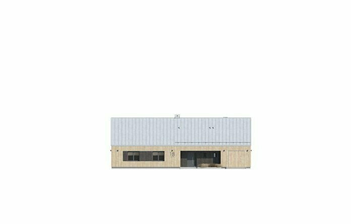 Дом вытянутый в длину, с гаражом на конце , входной зоной и лестницей сбоку. Высота помещений стандартная для одноэтажных домов — около 2,5–3 м.