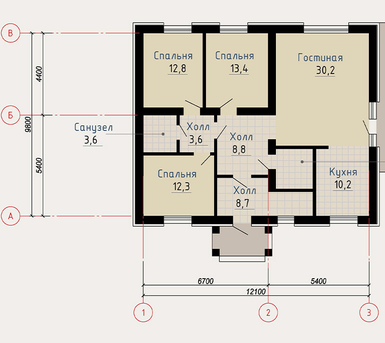 Три холла (8,8 м², 8,7 м² и 3,6 м²) служат связующими элементами, обеспечивая удобную навигацию между всеми основными помещениями дома. Они создают ощущение простора и могут использоваться для размещения встроенных шкафов и дополнительного хранения, что повышает функциональность пространства.