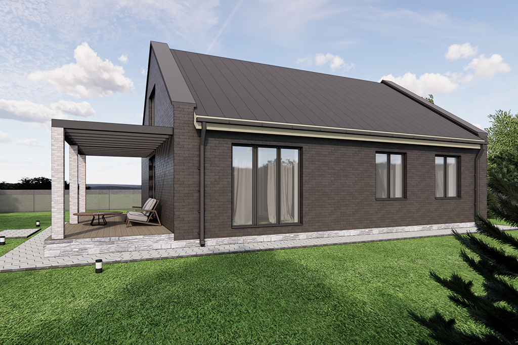Дом площадью более 100 м² спроектирован с учётом потребностей семьи из 3–5 человек, обеспечивая гармоничное сочетание просторных общественных зон и уединённых спален.