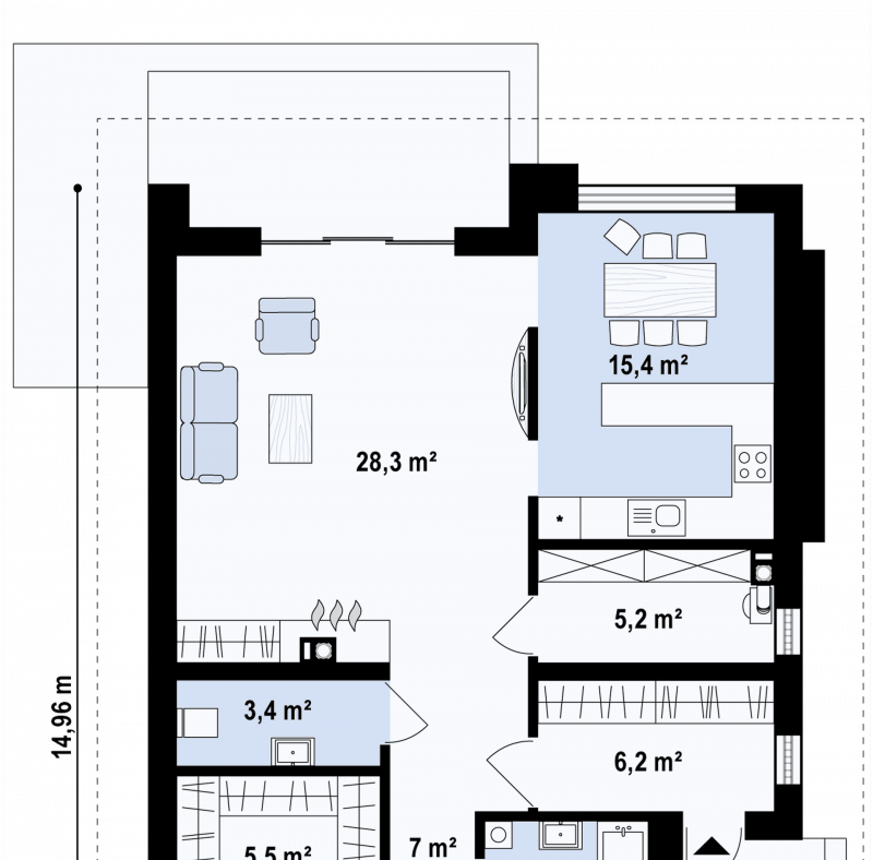 - Гостиная 28,3 м² — просторная комната с большим диваном и выходом на террасу, подходит для отдыха и приёма гостей.