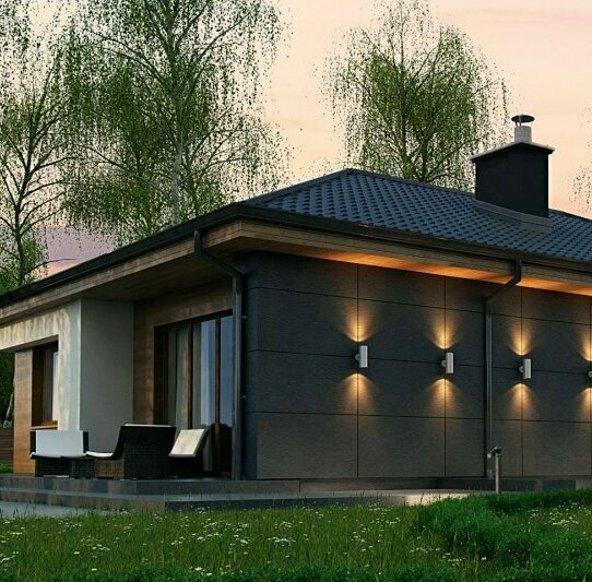 Это дом, в котором каждый метр работает на ощущение простора и уюта: компактный по габаритам, но по ощущениям — как полноценный семейный коттедж с большой гостиной и продуманной приватной зоной. Планировка выстроена по принципу «длинного взгляда»: от входа открывается перспектива через холл прямо в светлую гостиную и дальше — на террасу и участок.
