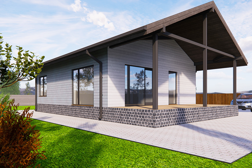 В целом планировка дома продумана с акцентом на комфорт, функциональность и рациональное использование пространства. Просторная гостиная, удобная кухня, две уютные спальни, два санузла, техническое помещение и дополнительные зоны отдыха делают этот дом идеальным выбором для семьи из 3–4 человек, стремящейся к гармонии и уюту в современном загородном жилье.