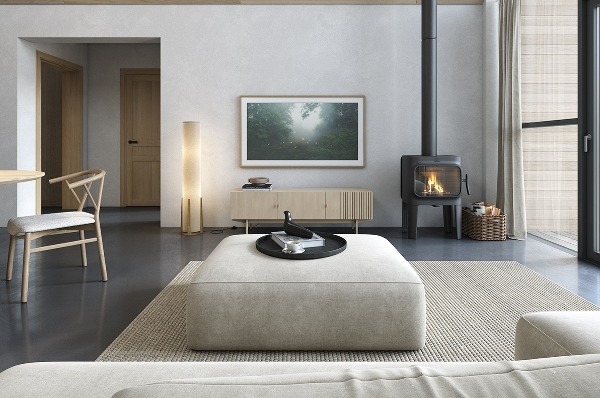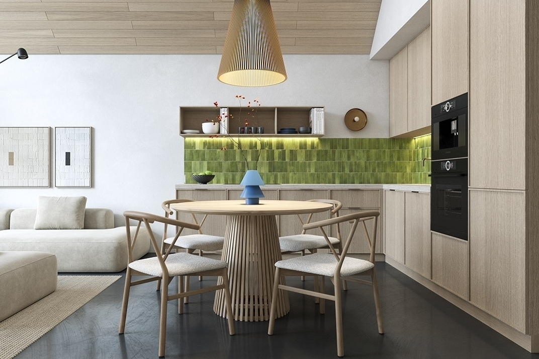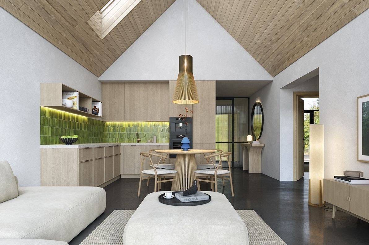 - Из гостиной предусмотрен выход на террасу или в сад, что визуально расширяет пространство и даёт много естественного света.