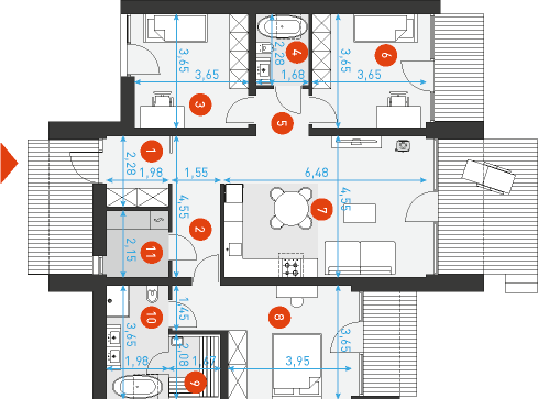 - Справа находится ещё одна спальня (8), которая может использоваться как мастер‑спальня или комната для гостей.